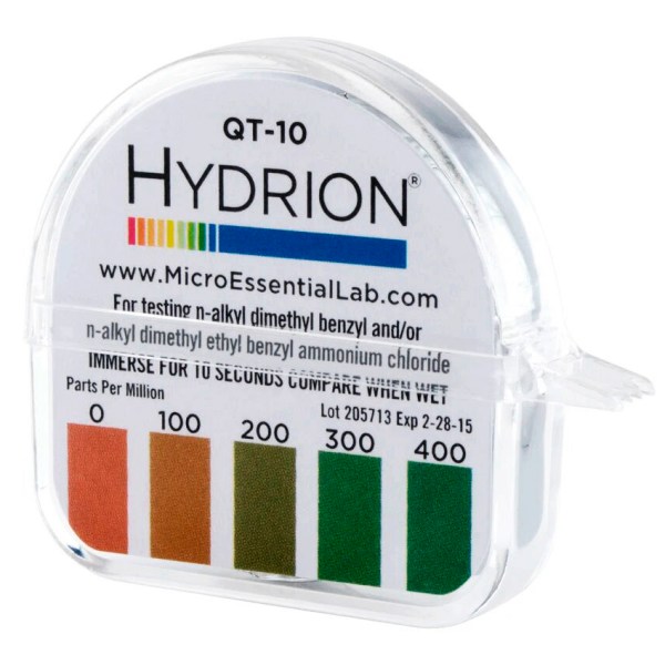 Simplemente se sumerge la tira reactiva correspondiente, ya sea para cloro o para sales cuaternarias de amonio, y se verifica el cambio de coloración que sufren de acuerdo a la tabla correspondiente de la tira. Si se encuentra en el rango indicado, tenemos la plena certeza de cumplir con nuestro cometido, garantizar la higiene de nuestros clientes en todo momento y punto de contacto con él.